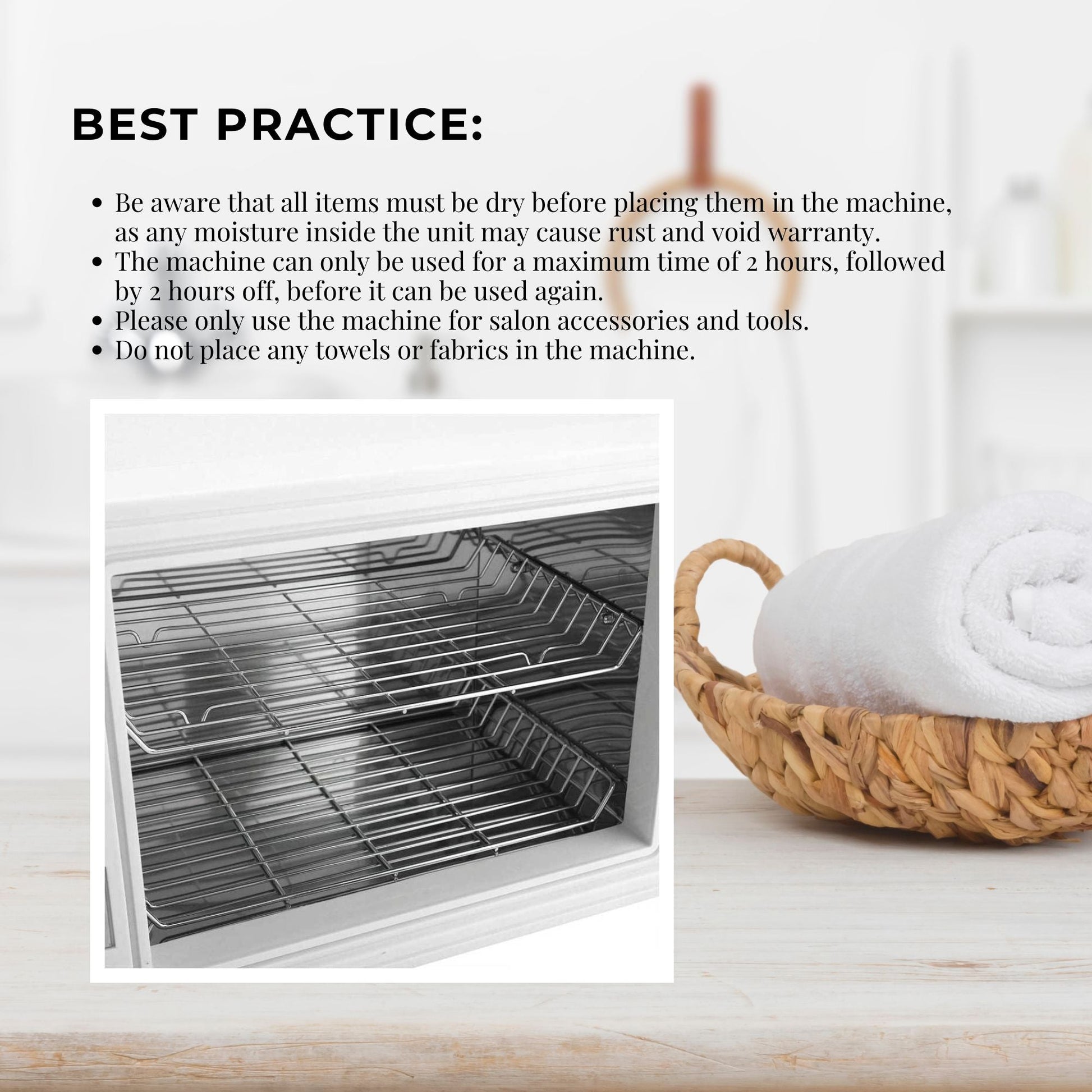 Please Note: Be aware that all items must be dry before placing them in the machine, as any moisture inside the unit may cause rust and void warranty.