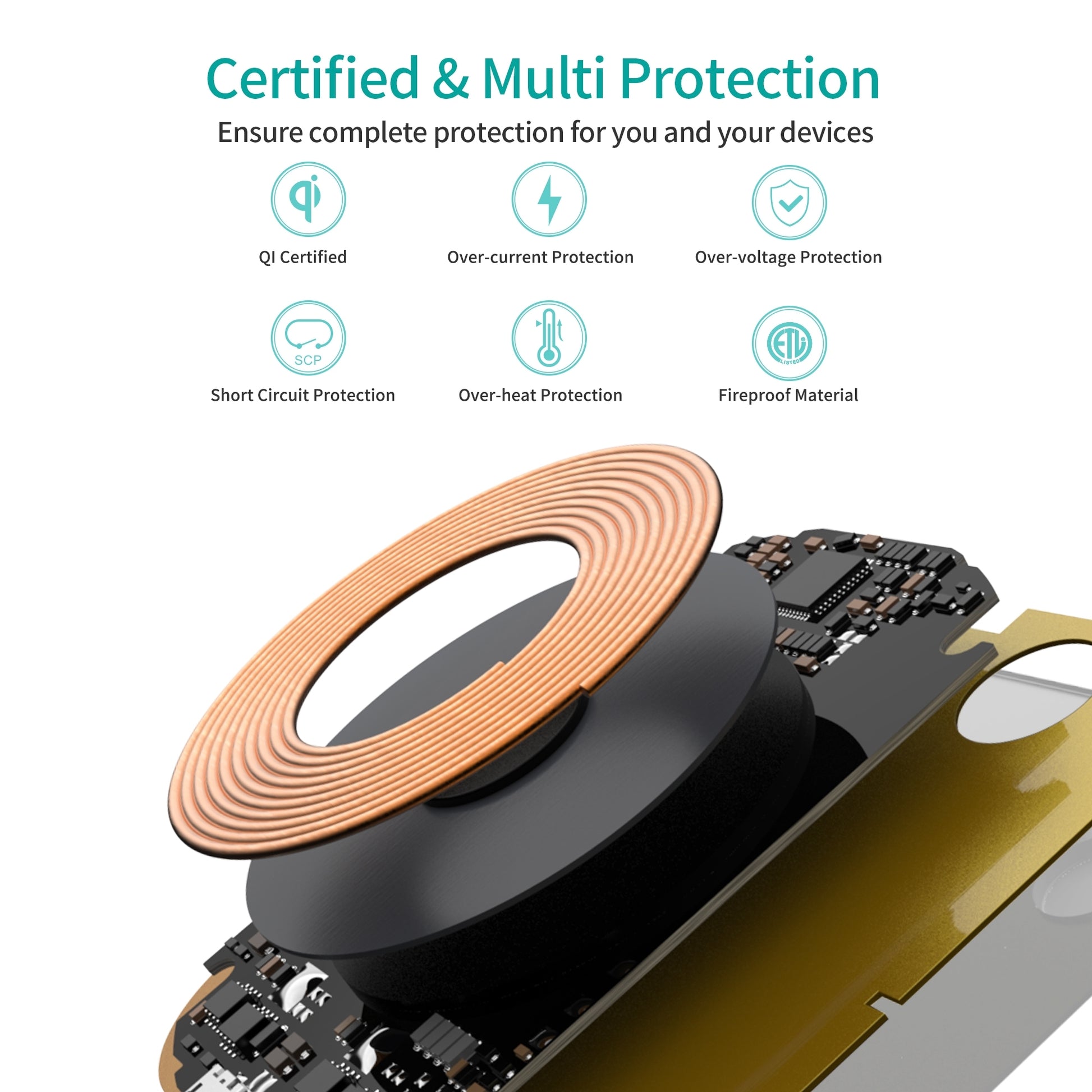 The wireless charger works with QI enabled device like iPhone X/8/8 Plus, iPhone XS/iPhone XS Max/iPhone XR, Samsung Galaxy S9/Note 9/Note 8/S8/S8+/S7/S7 Edge/Note 5/S6/S6 Edge/S6 Edge Plus and other Qi-Enabled devices, Multi protection system for all-around protection against over-charging, over-voltage, over temperature and over-current, provide a safe charge to protect your devices.