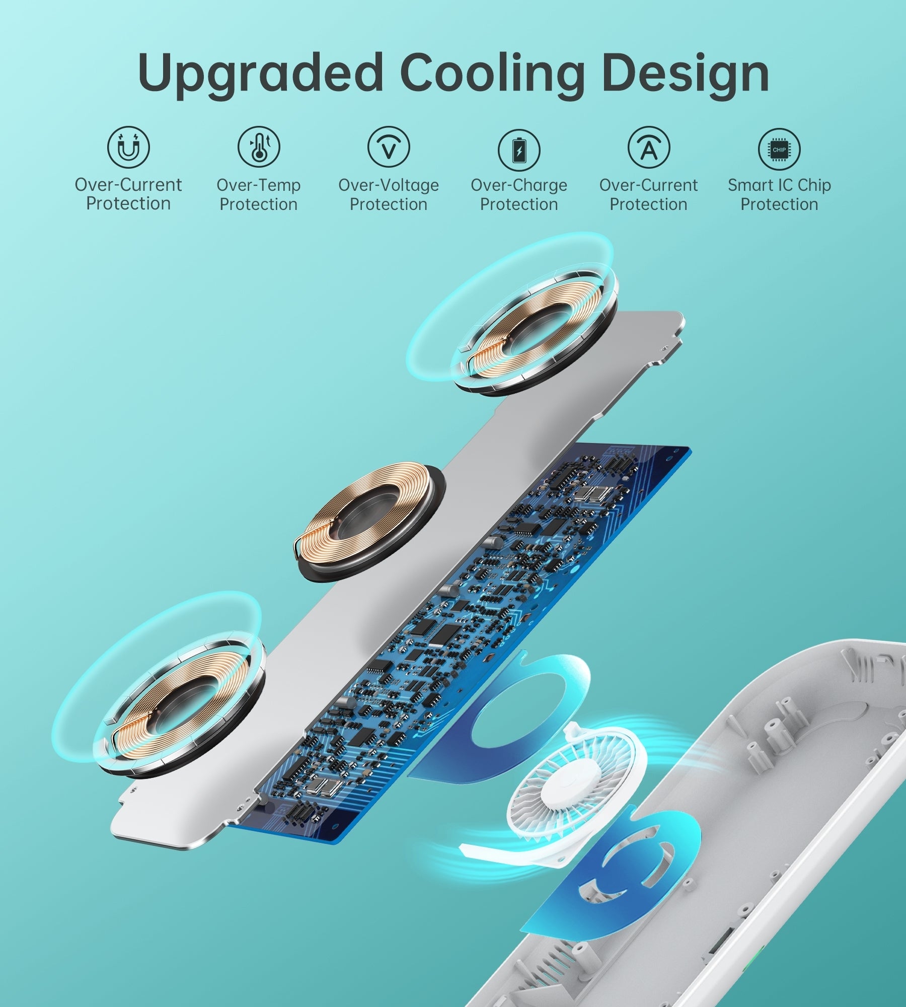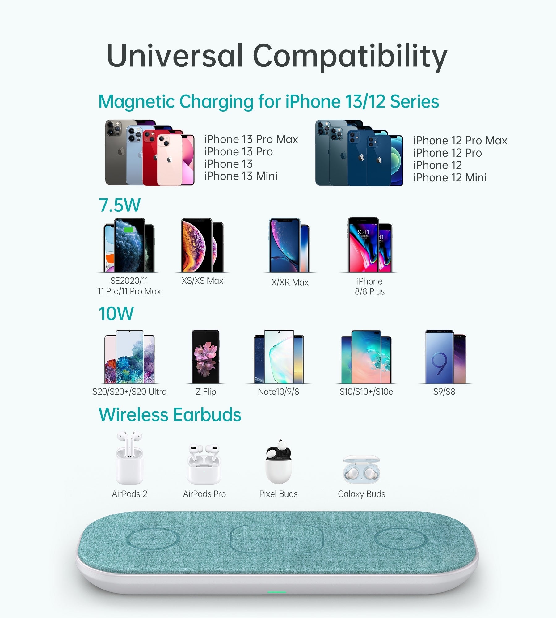 The magnetic charging coils on each side of this wireless triple wireless help you locate the best fast wireless charging position in just one second. With strong magnetic adsorption, you can change the charging angle freely while the device is till fixed in the charging center.