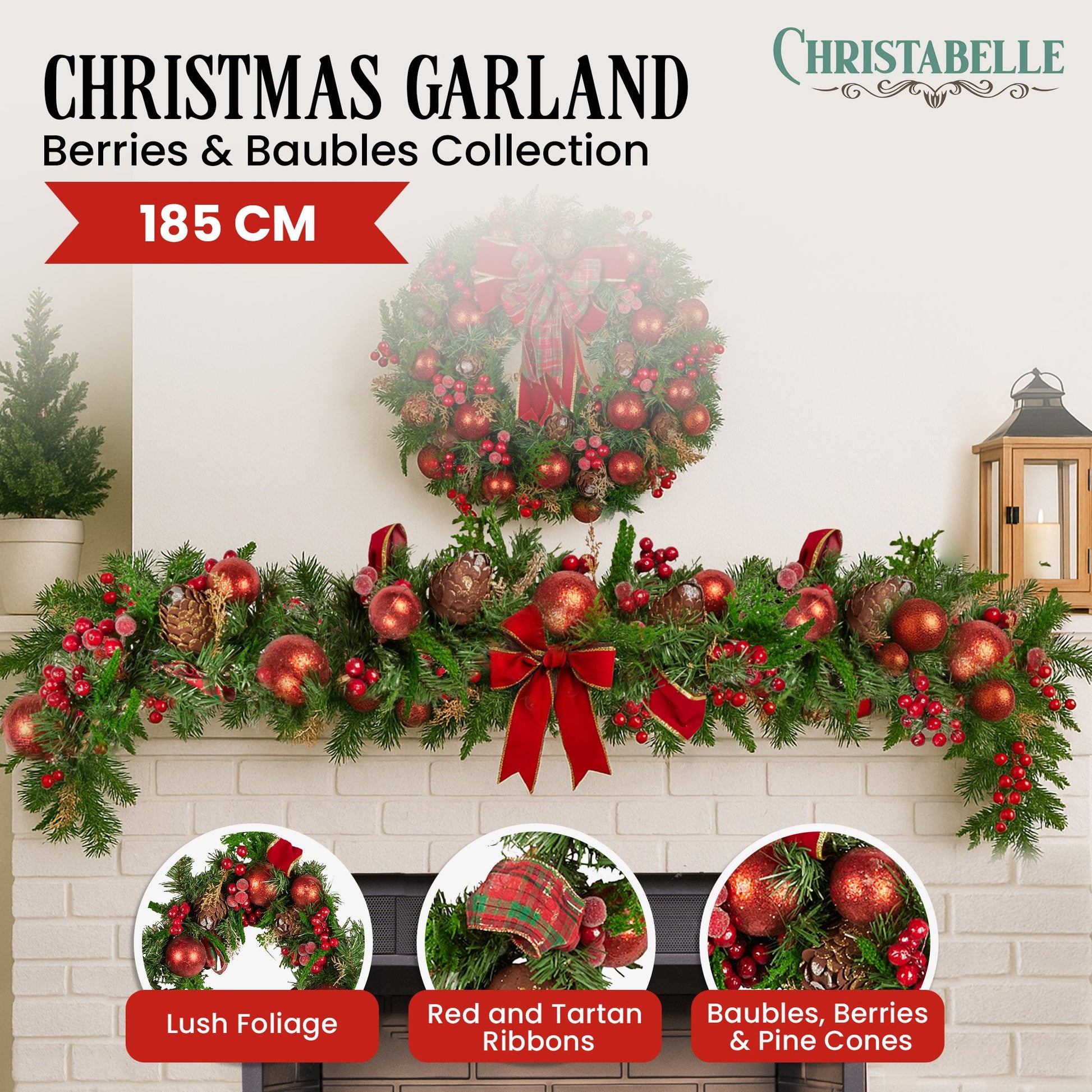 Christabelle 185cm Christmas Garland Lush Green Holiday Garland with Red Berries, Baubles & Pine Cones Pre-Decorated Festive Shelf or Banister Decoration