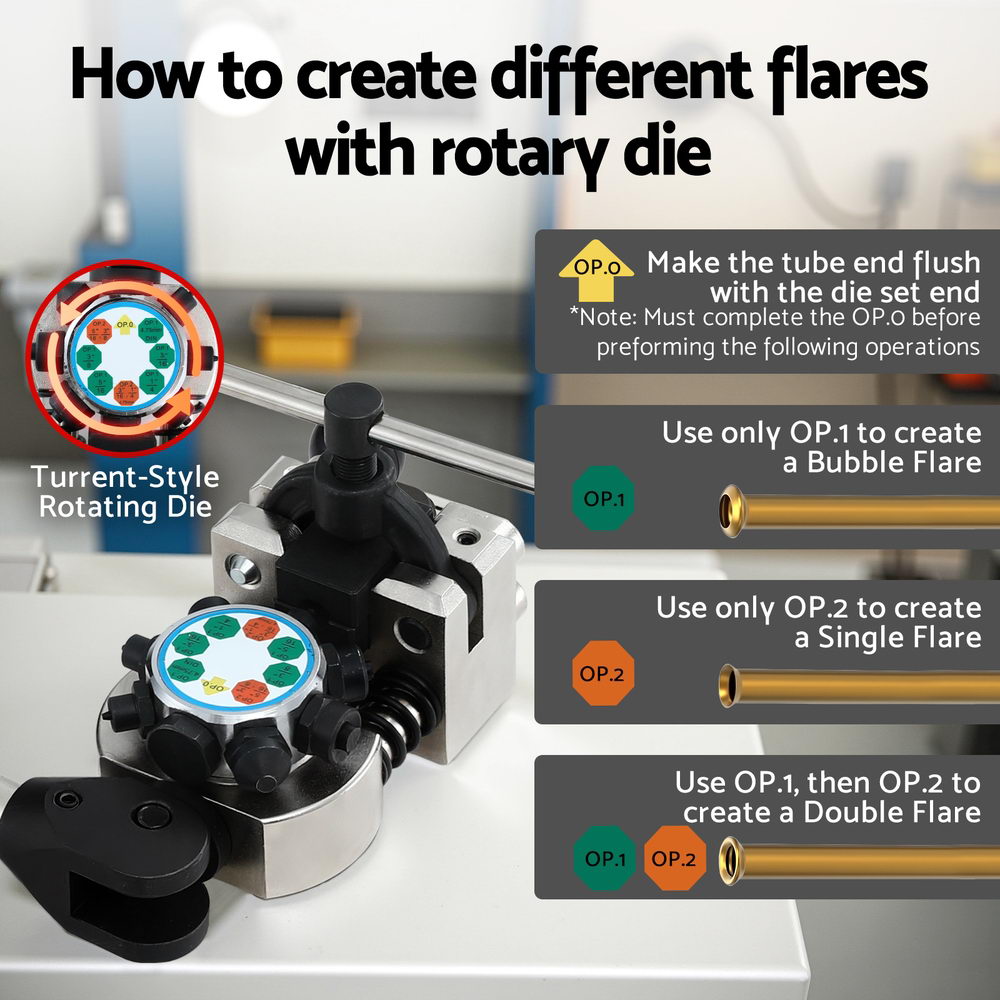 It features a turret-style 45° flaring tool, four interchangeable dies, and a heavy-duty 40CR steel pipe cutter - ideal for flaring steel, copper, and stainless steel tubing with confidence.