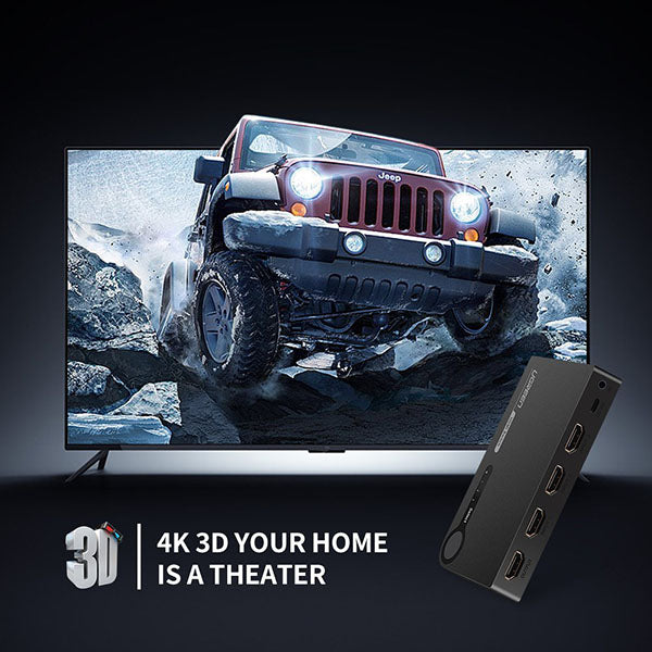 Ugreen 40234 HDMI 3×1 switcher provides a way to switch among multiple HDMI sources, like Laptop, HD-DVD, PS3, Xbox360 to a HDMI TV or display. It allows the switching of 3 inputs and maintains all signal components present within the encoded signal HDCP encryption. You could easily select from different programme sources via front panel push buttons or IR remote control without moving cables around.