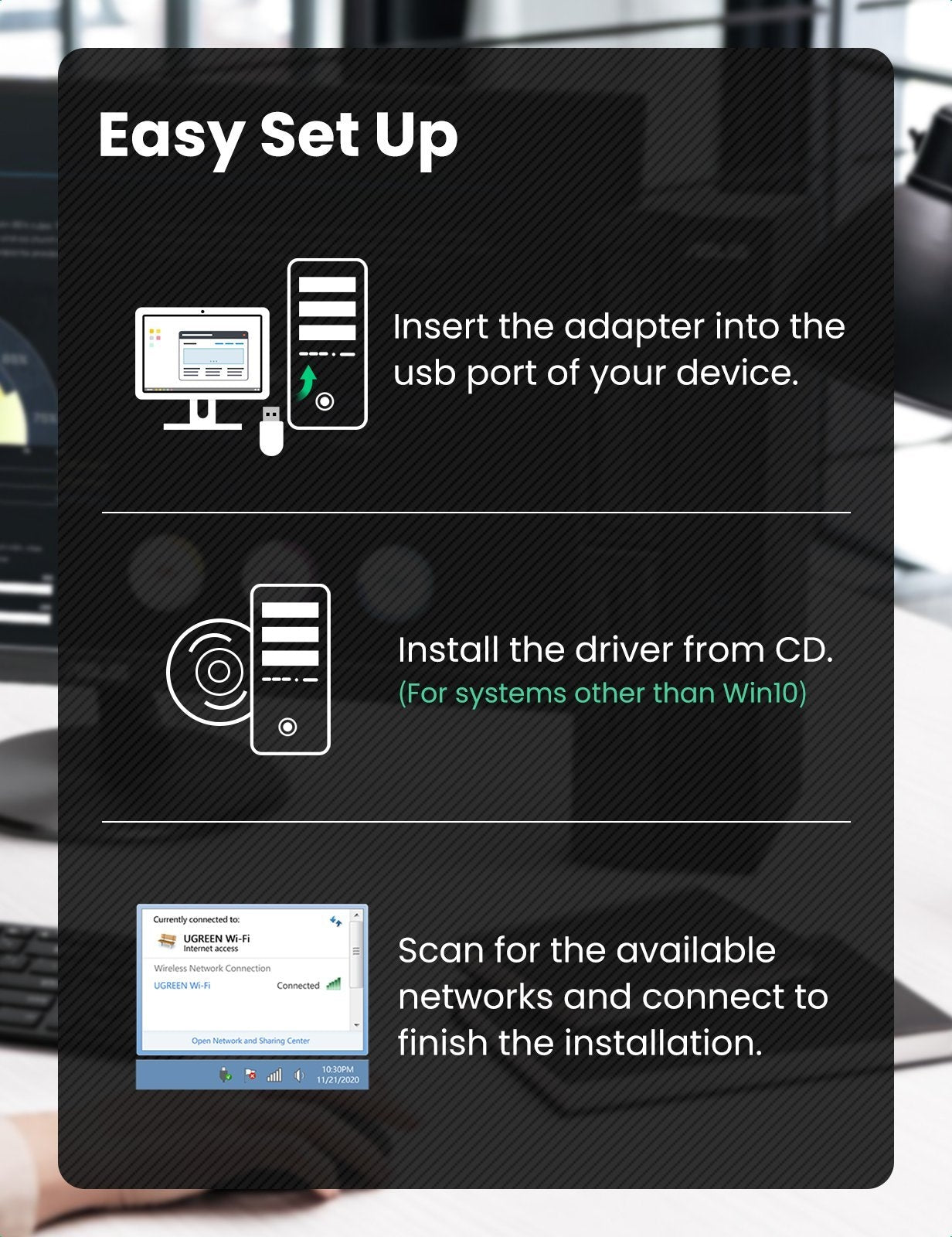 UGREEN USB wifi adapter can support most Windows, macOS, and Linux systems, so if you have these devices, you can use the USB wifi dongle on them without any obstacles.