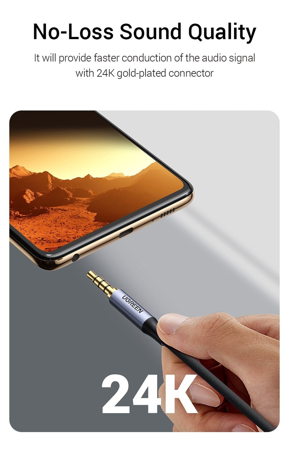 UGREEN Headphone Jack to Headphone Jack Cable is built to last forever. Combined evolved nylon braided jacket with reinforced wire joints, the Car Aux Cable passes 10000+ bend tests and can withstand any twist, tug, and tangle. Aluminum alloy shells resist corrosion and ensure optimum sound quality. Oxygen-free copper provides maximum conductivity and durability.