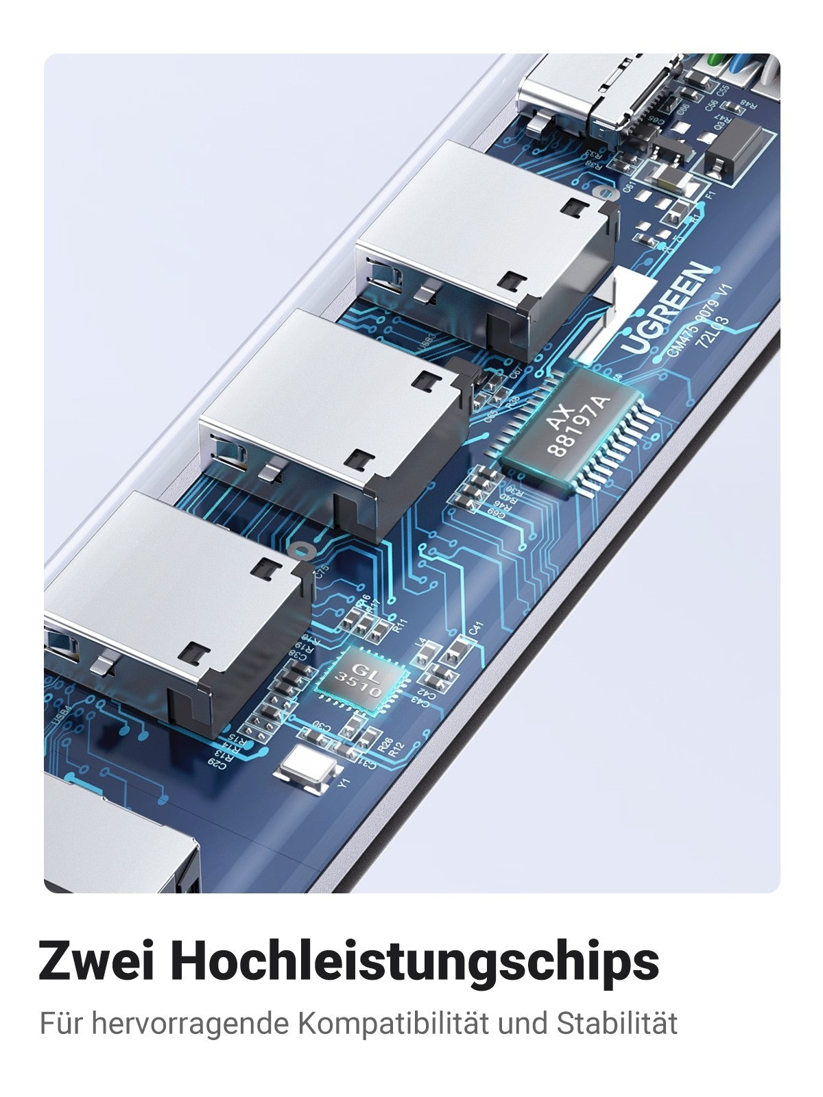 UGREEN USB 3.0 Gigabit Ethernet Hub is designed with 3 high-speed USB 3.0 ports, which can simply help your device to connect more accessories such as a mouse, keyboard, external drive, thumb drive, and more. And the data sync of USB 3.0 can up to 5Gbps, which is 10x faster than USB 2.0.